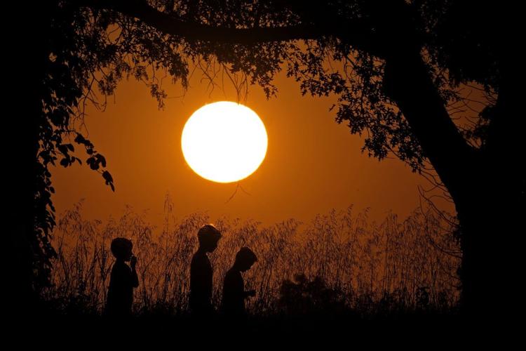 FILE - People are silhouetted against the sky at sunset as they walk at Shawnee Mission park, Sept. 26, 2024, in Shawnee, Kan. (AP Photo/Charlie Riedel, File)